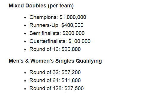 另外,入围单打正赛的球员只要完赛就将至少获得11万美元奖金。