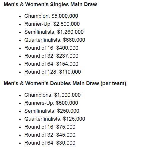 今年美网单打冠军将获得500万美元的奖金,亚军将获得250万美元的奖金,混双冠军得主将获得100万美元的奖金。其中单打冠军的奖金去年的360万美元提高了39%。