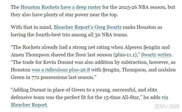 这位专家认为下赛季排名最强的三人组是雷霆队的亚历山大、杰伦·威廉姆斯和霍姆格伦,第2名的则是丹佛掘金队的约基奇、戈登和穆雷,第3名的是骑士队的加兰、米切尔和莫布里,而火箭队三人组杜兰特、阿门和申京则排名第4位。