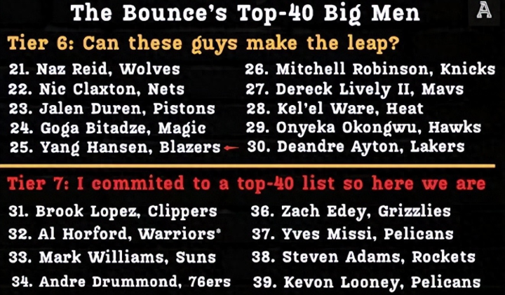 NBA新赛季未启,一场关于中锋排名的争论已席卷篮球圈——美国权威媒体《The Athletic》专家Zach Harper最新公布的40大中锋榜单中,中国新星杨瀚森高居第25位,力压独行侠冠军中锋莱夫利(第27)和湖人新援、前状元艾顿(第30)!