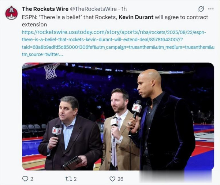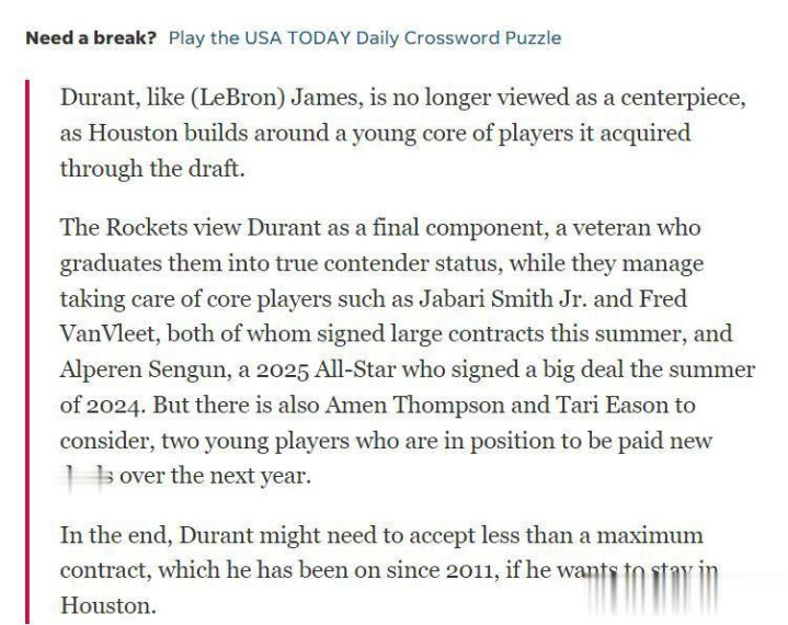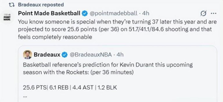 就账面而言,休城管理层这样的做法有些不厚道。要知道上赛季36岁的杜兰特,依旧是联盟中的大杀器,拖着重伤痊愈的身子,依旧可以打出场均25.6分6.1篮板4.4助攻1.2抢断的高光表现,除此之外,他的投篮命中率达到了顶尖水平,51.7%简直就是神迹,只不过外界,乃至媒体对于这样的表现,并不感到惊讶,反倒是格外在意他的伤病隐患以及忠诚度。毕竟出走雷霆,加盟金州勇士的做法,直接让联盟的生态环境,发生了改变。