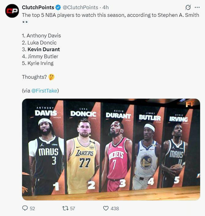 然而,作为名嘴的斯蒂芬-A-史密斯,也似乎吃起了瓜。他在节目中表示,新赛季有5位值得关注的球员,而凯文杜兰特,位居榜单第三。的确,有了上赛季的前车之鉴,阿杜的带队能力饱受质疑,现如今他需要带领这支平民化的球队拿出成绩就可以证明自己的价值。但是,所有的事情都没有那么容易。根据ESPN公布的新赛季战力排行榜预测,休城火箭仅仅位居第四,或许这样的结果出人意料,但是面对卫冕冠军雷霆以及刚刚完成补强的丹佛掘金,他们显得毫无胜算。那么,杜兰特的未来仍扑朔迷离。