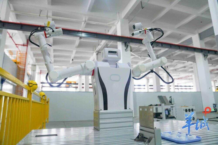 在现场,区别于爪牙舞爪挥舞臂膀的机械臂,一款看着颇有些“呆瓜”的半身人形机器人吸引了记者的目光。双臂有着不少关节的机器人,正在展示自己自由摆动的“胳膊”。杨林告诉羊城晚报记者,这是华数直面工业产线需求推出的工业人形机器人——具身智能双臂机器人。“我们专注于开发适用于工业场景的人形机器人,因此不会采用双腿设计。在工业制造环境中,机器人主要在车间内作业,其核心使命是确保生产流程的高效与稳定。”
